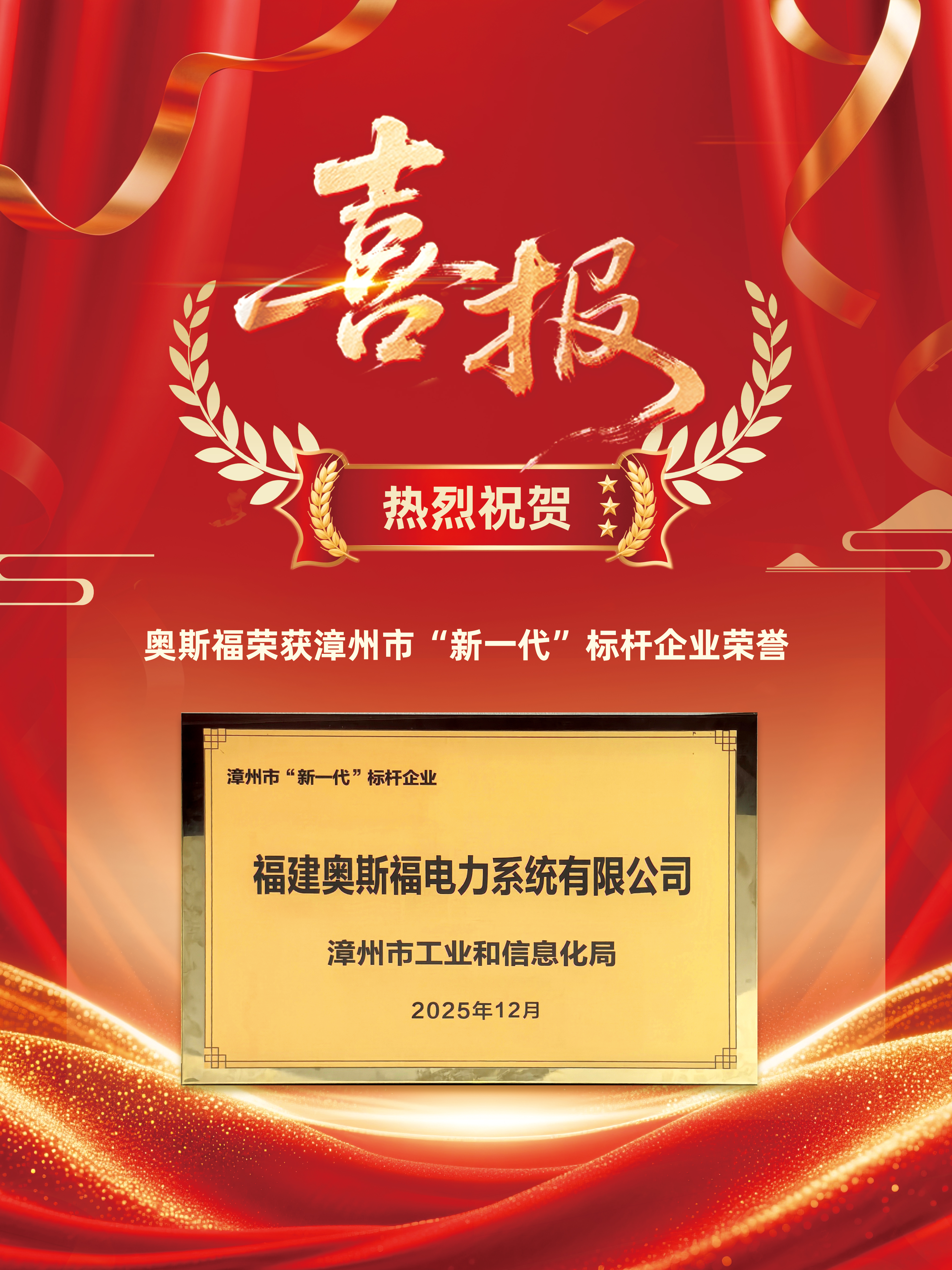 2026年初,奥斯福荣获漳州市工业和信息化局颁发的漳州市“新一代”标杆企业荣誉,成功跻身漳州新一代企业标杆行列,用实打实的创新与发展,诠释标杆企业的责任与担当,成为区域产业升级与高质量发展的核心力量。